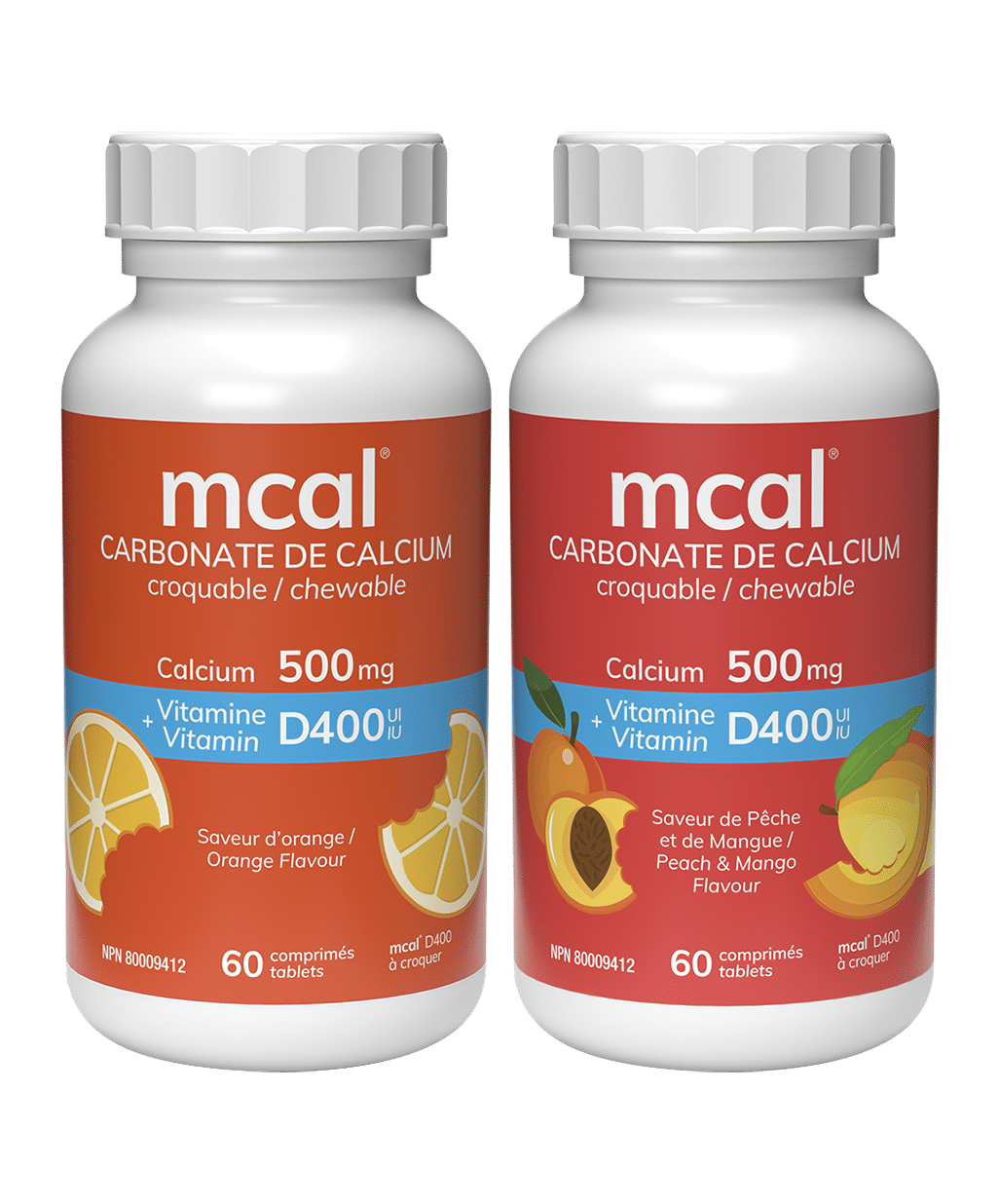 Comprimés croquables mcal® D400 à saveur d’orange, ou pêche et mangue.